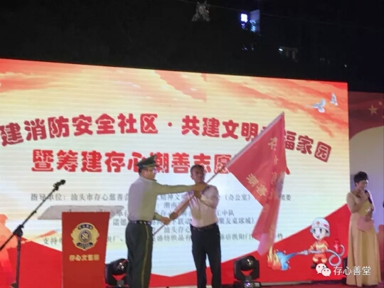 2017年11月15日,存心潮善义工中队在潮南陈店湖西公园举行“筹建存心潮善志愿消防队“启动仪式。存心党支部书记 吴宏文、庇护安养院兼特护院蔡树楠院长、特护院章秋音副院长出席活动,活动现场,由潮南区消防大队专业消防员指导存心志愿消防员进行实战演练。