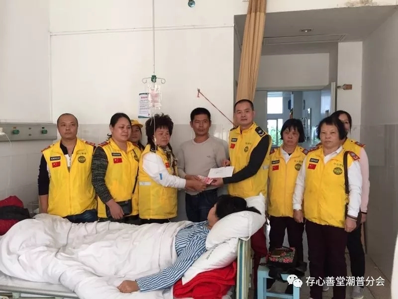 2017年12月24日下午,在汕头存心善堂潮普分会杨右铭会长的指示下,张宝琴干事带领存心美德义工们前往汕头大学肿瘤医院看望邹汉卿(周旭宜老婆),为其送去5400元医助金(潮普分会3000元,2000元由社会热心人士委托潮普分会代捐,同往义工400元)并鼓励邹汉卿一家坚强面对生活。