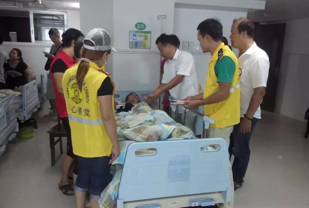 苏伟雄,现年42岁,是家里的经济支柱,有一子,系一级残疾病人。8月11日,苏伟雄因脑出血、高血压、肺部感染、脑萎缩等疾病在普宁市人民医院住院治疗,已花去10多万元。苏伟雄的家人在已完全无力承担后续治疗费用的情况下到存心潮普分会来求助。存心潮普分会核实情况后,遂即派工作人员到医院慰问并送上医助金。