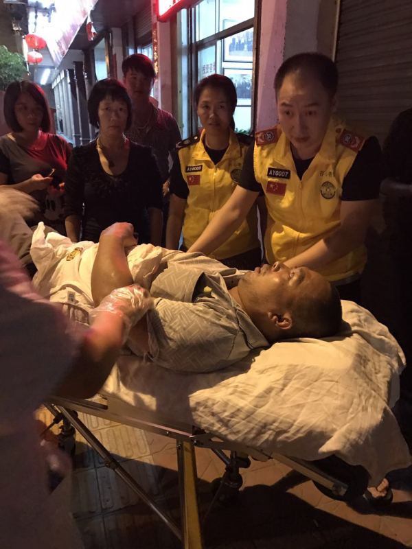 恰逢存心义工同力服务队的队址就在隔壁,义工们闻讯连忙出来帮忙。其中一位比较有经验的队员,赶紧用衣物塞入患者口中,防止他在抽搐过程中不小心咬到自己的舌头,随后队员们拨打110报警及救护车,将患者送往医院就医。