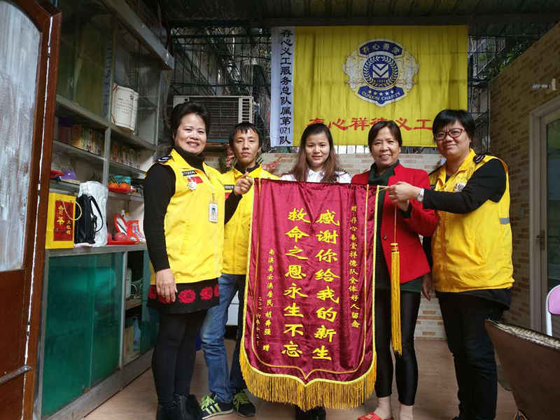 上个月南澳居民胡舜强突发脑血管破裂,急需血液和血小板。存心祥德义工队获悉后,上下同心,联合爱心朋友们一起为他献血跟血小板,发动所有力量给予最大的援助心。经过8小时的脑部手术,胡舜强终于脱离险境,现已康复回家。近日,胡舜强一家特地从南澳赶到汕头,赠与存心祥德义工队一面锦旗,感谢他们的倾力相助。