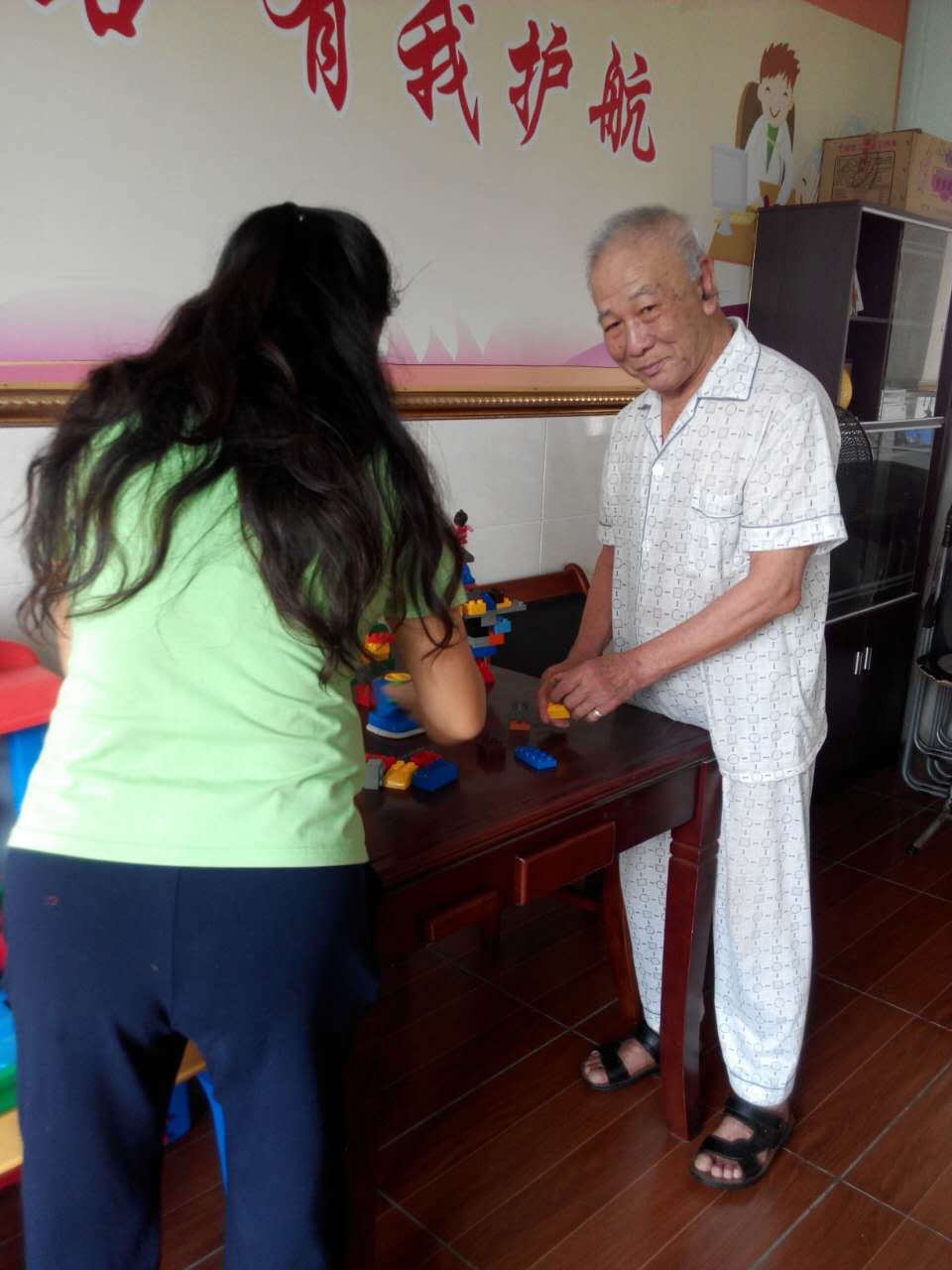 初次碰面,陈叔一直微笑着,红光满面,笑起来有点像个小孩,特别是他拿几块积木在手中把玩,锻炼智力和手指的灵活性时,更显孩子气,应证了“老人就像小孩一样”这句老话。