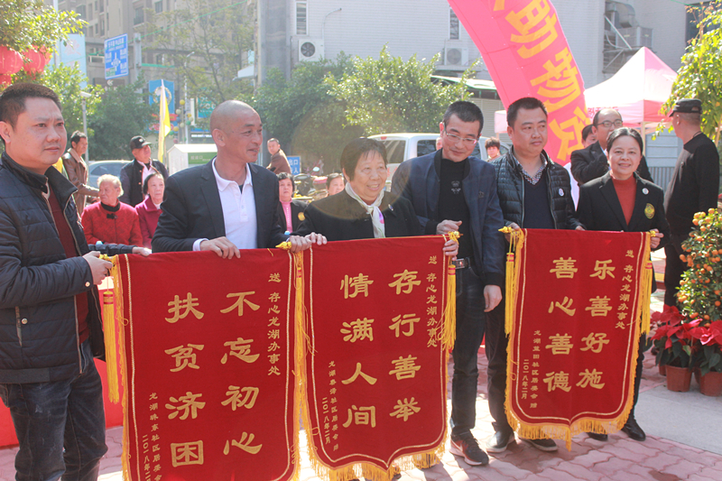2018年3月10日上午,又是存心龙湖办事处每月一次发放爱心物资的时间,蓝田、春泽、珠东三个居委负责同志亲自向存心善堂龙湖办事处送来锦旗,感谢存心龙湖办事处每月定时定量发放爱心物资,一直帮助辖区内受助户,对存心龙湖办事处的善行善事给予肯定和鼓励。