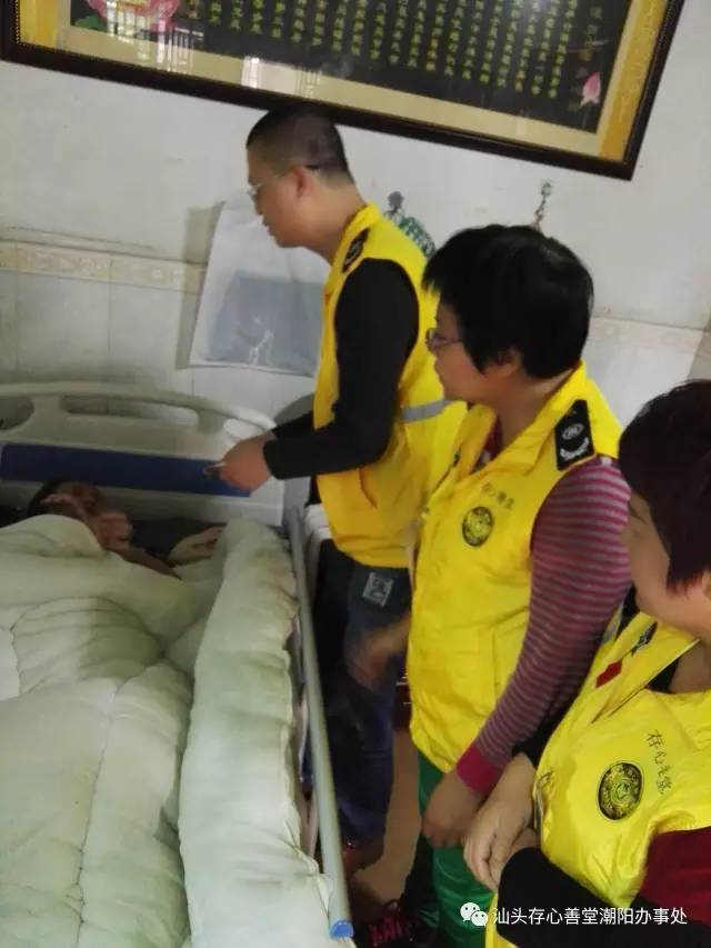 存心潮阳办事处派员了解情况后,于隔日,存心义工和畅服务队陈海庭队长、连素兰和廖丽霞等义工,代表办事处前往医院慰问老庵主,送去大米、食用油等物资,以及助医金4000元。