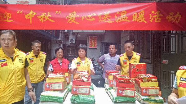 9月13日下午,存心义工援助服务队在华坞片区举办“迎中秋,送温暖”活动 ,为华新居委、炽昌居委及周边地区40多户困难户送上米、面、饼干、月饼等爱心物资,帮助他们过个好佳节。