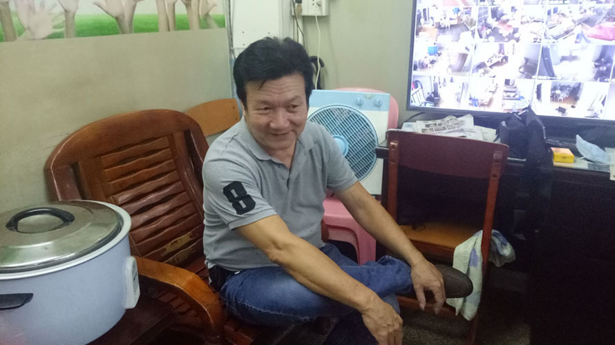 李园白今年六十多岁,是汕头市人,进存心庇护院当护工一年多,主要负责楼下的老人的日常生活照料。李园白大哥虽已六旬出头,但一点也不显老,相反,体魄强壮,很显年轻干练。