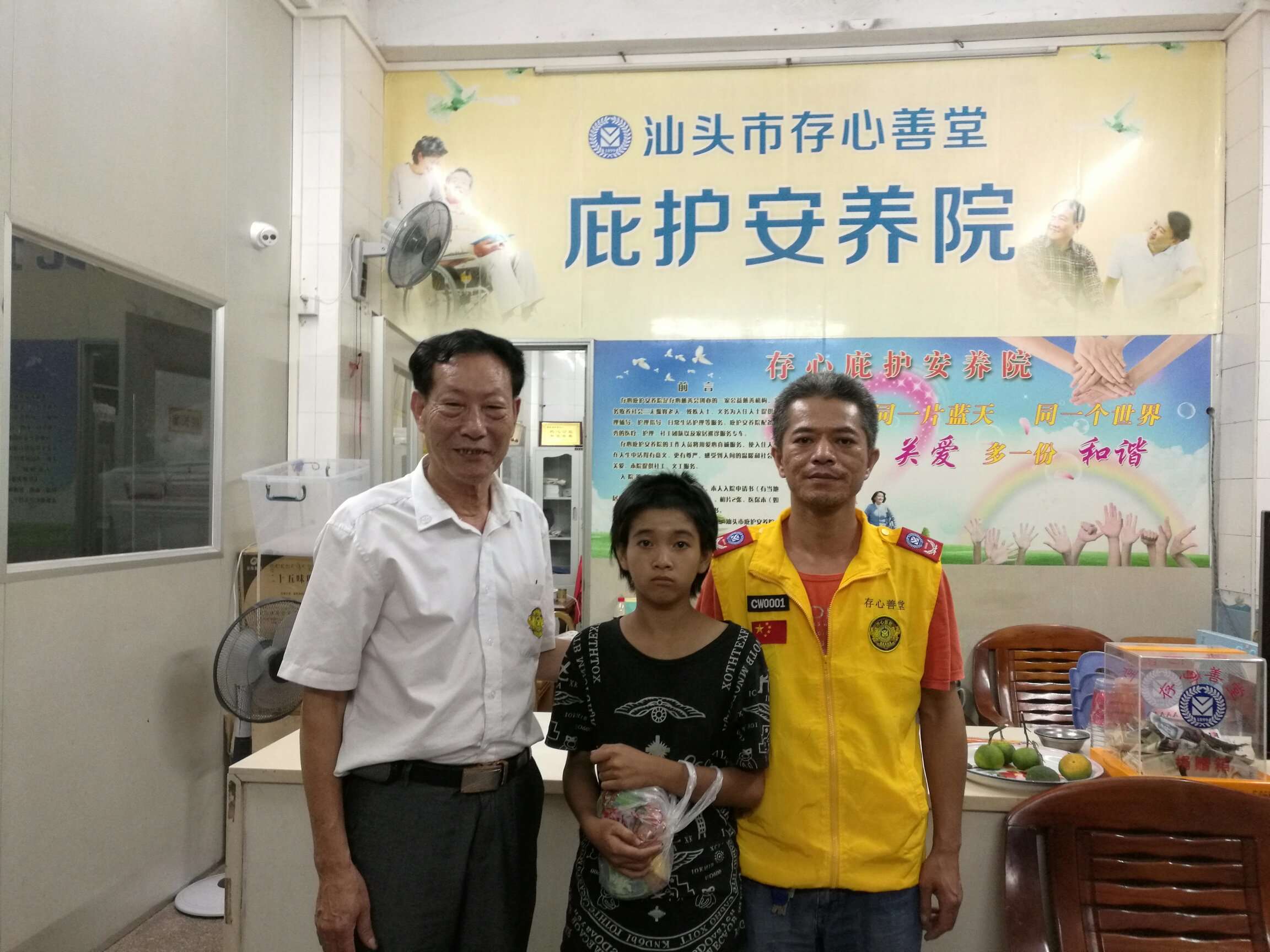 在存心潮善义工队叶队长的陪同下被送到存心庇护院,年过七旬的蔡树楠院长连夜赶到院部为其办理入住手续。