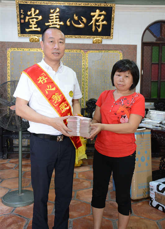 有困难找存心;吴永龙,男,48岁,潮阳金灶人,在家打散工,两年前查出尿毒症,做了换肾手术,需长期调理,今年8月份出现便血,查出直肠有12厘米长的肿瘤,已到肿瘤晚期,需做肿瘤切除,手术费需8万元左右,已无力承担医疗费用,只能向存心善堂求助并发起存心筹,9月26日,存心筹爱心使者小组在徐英豪组长的带领下,将社会热心人士捐赠的人民币壹拾万贰仟柒佰多元(102730.00元)善款送到其亲属手中,缓解他们的经济压力。存心在行动,如果您身边有需要帮助,可关注存心善堂公众号或汕头橄榄台进入存心善堂求助,我们就在您身旁。
