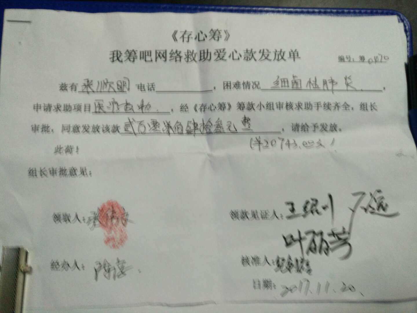 有困难找存心;张顺明,男,60岁,潮南雷岭双新人,身患糖尿病、高血压和病毒性肺炎,多次住院治疗病情无好转,全家靠务农和打散工为生,经济困难负债累累,幸得向存心潮普分会求助,善堂为其发起存心筹,12月1日,存心筹爱心使者小组在徐英豪组长的带领下,由分会杨右铭会长代表社会热心人士捐赠的人民币贰万余元(20743.00元)善款送到其亲属手中。缓解他们的经济压力,存心在行动,如果您身边有需要帮助,可关注存心善堂公众号或汕头橄榄台进入存心善堂求助,我们就在您身旁。
