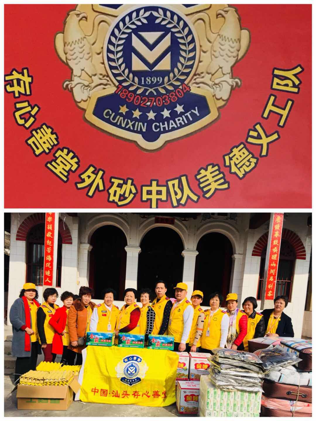 2018年2月2日,存心外砂中队美德队开展春节送温暖活动,对外砂蓬中村、李厝村、五香溪村等乡村20户困难户送上棉被、油、米粉、鸡蛋、纸巾、外套棉衣等爱心物资及慰问金,总价值8000元,是来自社会各界热心人士的大力支持和乐捐,一点一滴,都汇聚了众多的爱心,让困难家庭度过一个温暖、开心、快乐的新年。