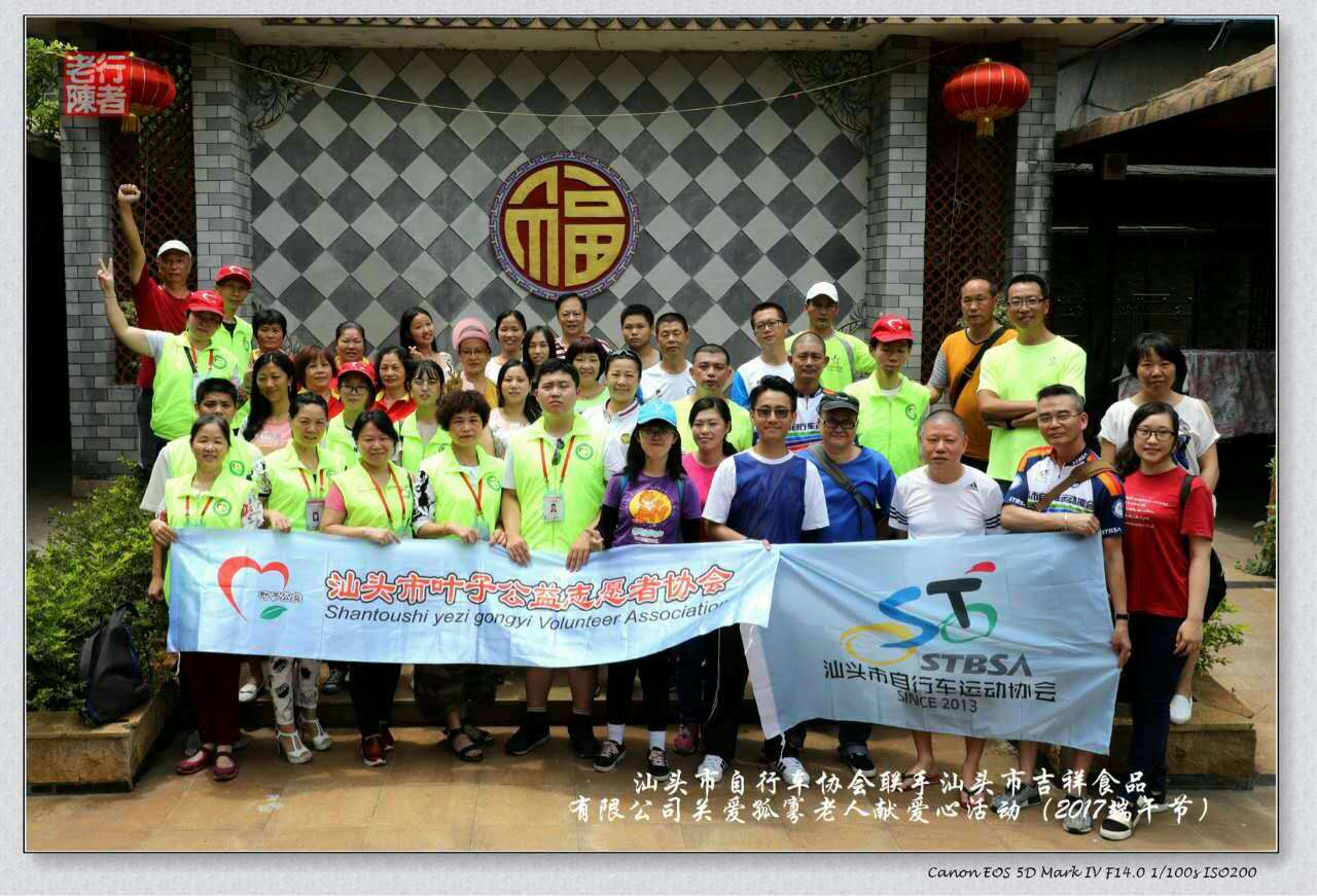 端午节:上午十点,汕头市自行车运动协会联手汕头市吉祥食品有限公司关爱孤寡老人献爱心活动在存心养老院举办。车友,驴友还有各路志愿者煮粽子,包馄饨,到各个房间床前给老人送餐喂食,帮助养老院的义工为老人家整理房间床铺,车友们打扫起院子里的落叶杂草。感恩大家大爱还有老陈兄连续两年来为老人照相和加相框给老人留念