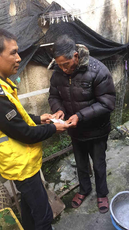 杜绍山患有精神病,父母亲体弱多病,在家照顾杜绍山,一家人的生活全靠其弟弟支撑,生活十分困难;存心义工仁和服务队下午给他们送上米、油、面等生活物资,以及新年祝福慰问金200元。