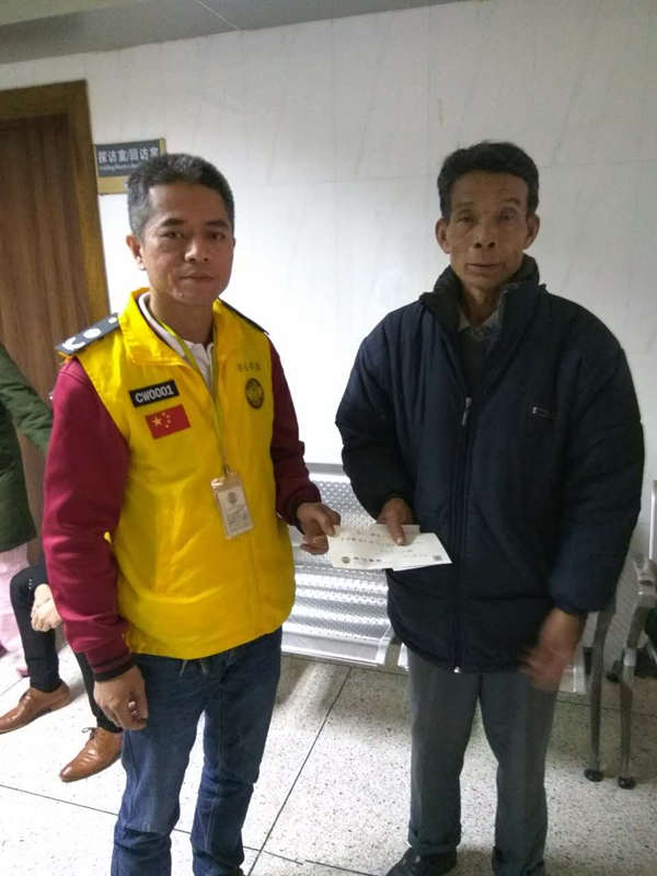今年26岁的黄远坡,其妻许泽凤于2016年12月31日产下一早产女婴,体重3.1斤,属低出生体重儿、新生儿败血症、重度贫血、低钙血症,在汕头潮南民生医院进行保温治疗,家庭经济困难,存心潮善义工核实情况后,前往医院看望女婴,给他家送去了温暖。目前,该女童各项指标恢复正常,已出院回家。