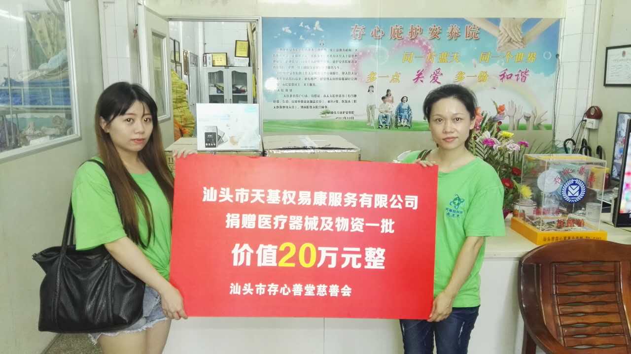 9月9日,“善爱同行·感恩回报·焕发生机·共创辉煌”天基权集团15周年、汕头天基权7周年感恩庆典暨G SLT新品汕头发布会在金海湾大酒店宴会厅举办,发布会现场释延豹董事长、陈友满总经理向汕头存心慈善会捐赠了价值20万元的医疗设备及物资,存心慈善会秘书长徐庆瑞代表存心慈善会接受了捐赠。
