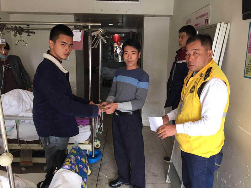 存心坝头义工联盟中队得知情况后,即刻与王喜波先生取得联系,只因王喜波父亲去年住院治疗,在中队的协助下曾向社会各界热心人士求助筹措了一笔助医金,其父亲康复后剩下的4000元善款寄放在中队备用,因此,中队林贤冲副中队长、无私队王海平队长和王喜波先生一同前往医院,送去4000元善款,将爱心传递下去。