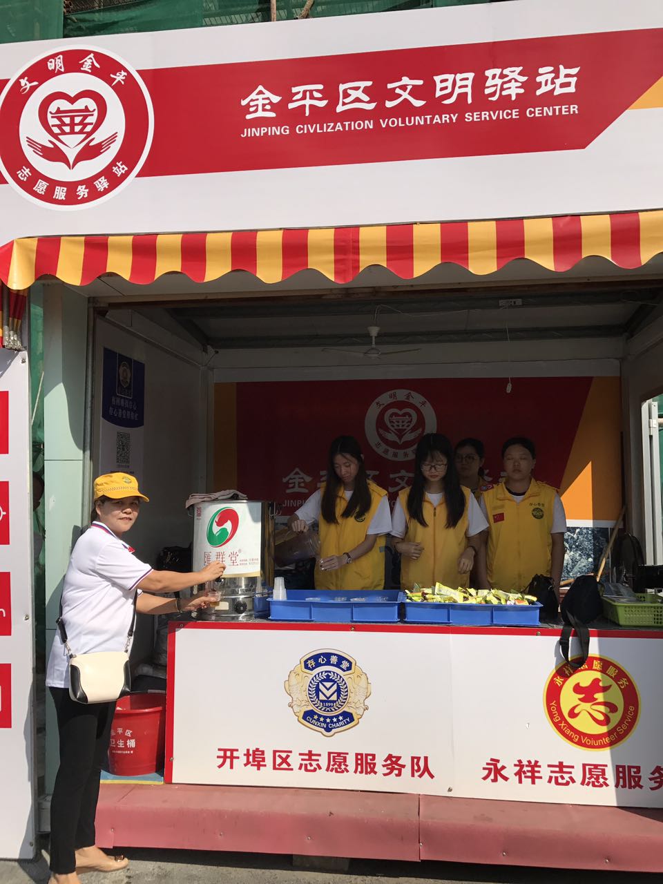 卓炬明主任品尝文明驿站的凉茶,消暑解热,给予志愿者工作肯定。